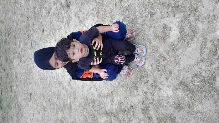 An outdoor scene in the city of Lhokseumawe, Indonesia, depicts two individuals on dry, light brown ground with sparse patches of grass and small debris. An older female, dressed in a black hijab, a blue long-sleeved top with orange accents, and light-colored sandals, is positioned in a crouch behind a young male toddler. Her hands are placed around the toddler's torso/arms, providing support. The toddler, with dark hair, is wearing a black short-sleeved t-shirt, black pants with a white 'NY' logo on the left knee, and light blue and white flip-flop sandals featuring a yellow character design. The toddler faces forward, while the older female's gaze is directed downwards. The background consists of indistinct, similar ground.
