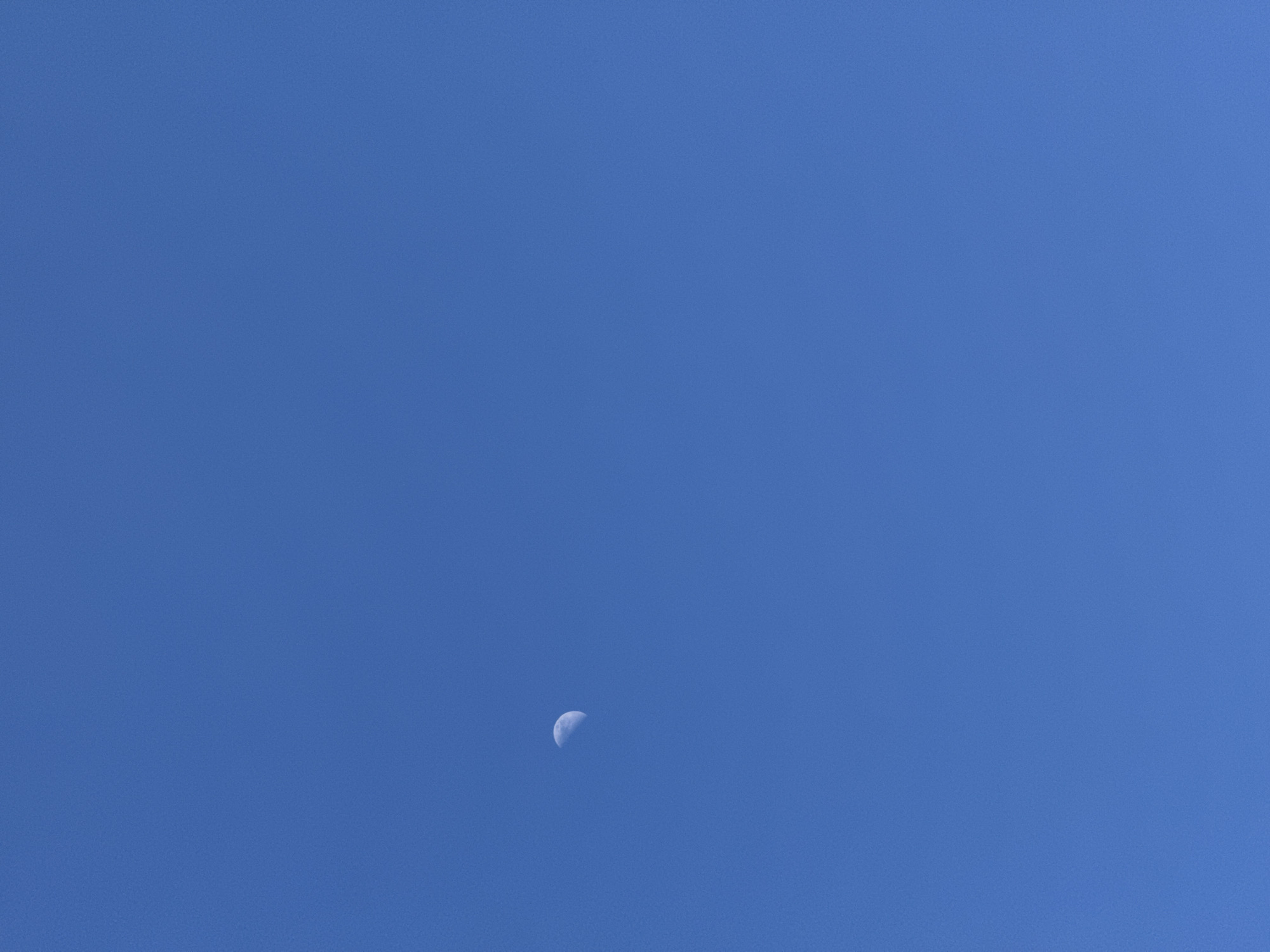 The scene depicts a clear, uniform blue sky. A crescent moon, exhibiting a distinct illuminated curve and discernible surface features, is visible in the upper-left portion of the frame. The sky is entirely clear, with no clouds, people, or other objects present. The location is the Cherwell District, United Kingdom.