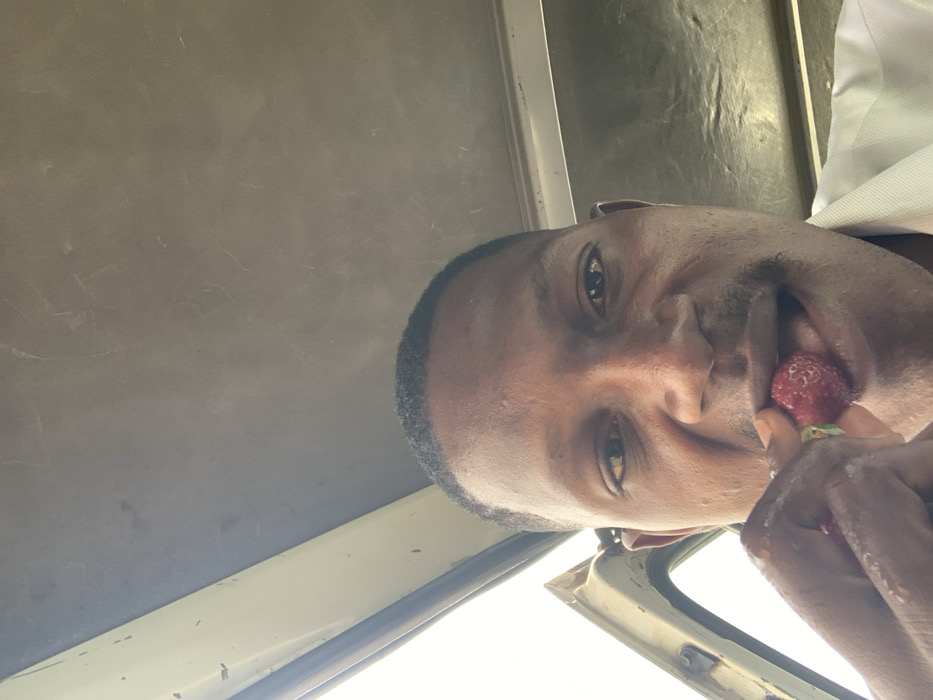 An adult male with dark skin and short dark hair is captured in a close-up, upward-angled photograph, likely a selfie. He has a thin mustache and wears a light-colored collared shirt, visible on his right side. His left hand, appearing wet or glistening, holds a red strawberry, which he is inserting into his mouth. His gaze is directed forward towards the camera. The background indicates an interior space, consistent with a vehicle. Above him is a light-colored, textured ceiling. To his left, an open vehicle door or window frame with a light-colored, worn panel reveals a bright, overexposed outdoor light source. To his right, a darker horizontal panel is visible. The specific location within Abuja, Nigeria, is not discernible from the visual evidence in the image.