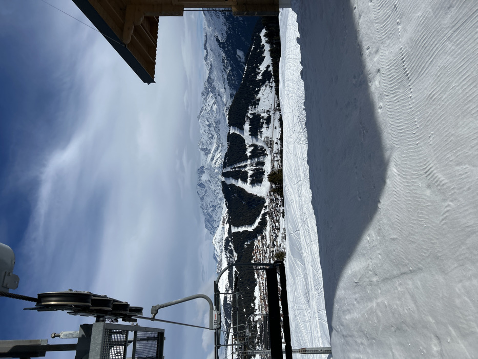 The image presents a panoramic winter landscape from a ski resort in Villard-sur-Doron, France, under a partially cloudy blue sky. In the foreground, snow-covered ground exhibits numerous ski tracks and a distinct dark shadow cast across its surface. The snow also shows textured ripple patterns. The upper-left quadrant features the intricate metal structure of a ski lift mechanism, including cables, pulleys, and a suspended empty ski chair labeled "803 Doppelmayr." To the far right, the corner of a building with a dark, sloped roof and exposed wooden eaves is visible. The midground encompasses a valley with a village comprised of multiple buildings, identifiable by their reddish-brown roofs, situated amidst dark evergreen trees. Several wide, groomed ski slopes with visible tracks descend through the forested mountain. The background is dominated by an extensive range of rugged, snow-capped mountains. No individuals are present in the scene.