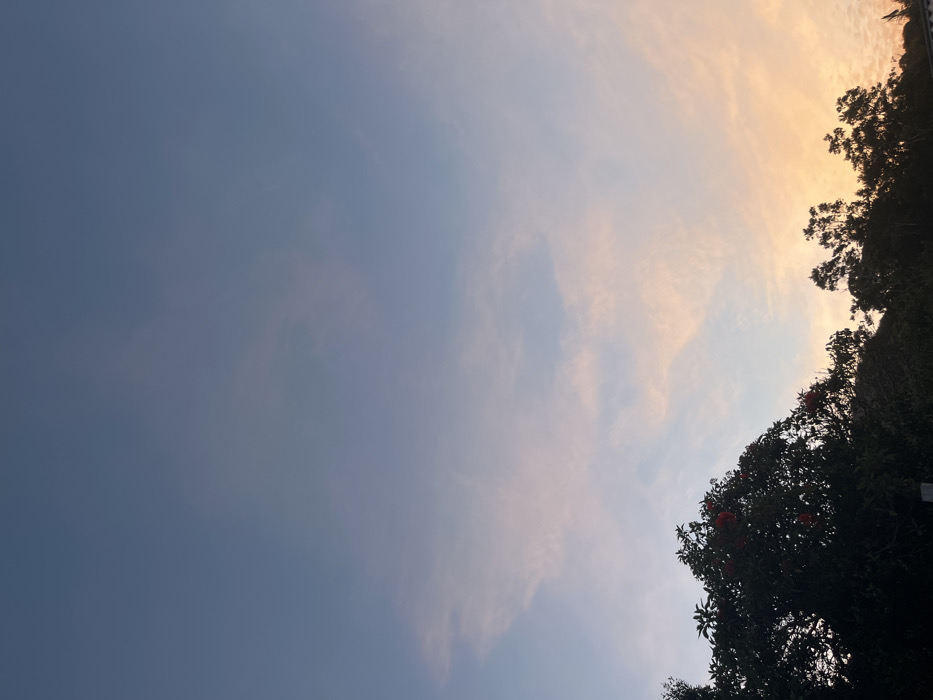 The image displays an outdoor scene in Coalcliff, Australia, at what appears to be either dawn or dusk. The sky occupies approximately the upper two-thirds of the frame, exhibiting a gradient from a light blue-grey at the top to soft pink and orange hues towards the horizon line. Scattered, wispy cloud formations are present throughout the colorful sky. The lower third of the image consists of a dark, silhouetted tree line. On the left, a dense tree or bush features dark foliage with discernible red-orange blossoms or fruits. Towards the right, an irregular canopy of additional trees forms a dark silhouette against the lighter sky. No human figures or distinct man-made structures are visible.