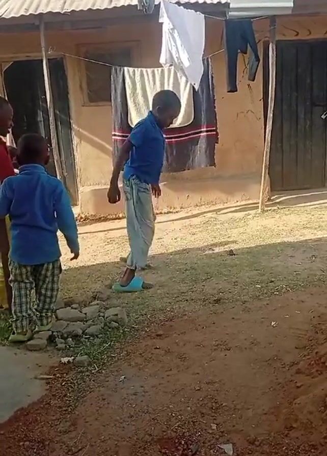 three children outside a building. One child, wearing a blue shirt and light-colored pants, hops around in blue sandals. Another child, wearing a similar blue shirt and plaid pants, stands nearby. The third child is partially visible on the left side of the frame. The building behind them has a corrugated metal roof and what appears to be a mud wall. Clothes are hanging on a line in front of the building. The ground is a mix of dirt, grass, and small rocks.