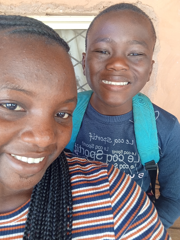 The image depicts two individuals, an adult female and a younger male, posing for a close-up photograph in Barakin Akawo, Nigeria. The female is positioned in the foreground on the left, her face partially visible, presenting a dark complexion and braided hair. She wears a horizontally striped garment with orange, white, and navy colors and is smiling with her teeth showing. The male is situated slightly behind and to the right of the female. He has a dark complexion, short hair, and is wearing a navy long-sleeved shirt with white, inverted text (identifiable as "Le coq sportif"). A light blue/teal backpack with black straps is visible on his shoulders. He is also smiling with his teeth showing. The background consists of a light brown/tan wall and a white-framed window with a security grill and a white curtain partially visible. Natural light illuminates the scene.