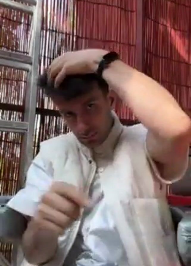 A man wearing a white T-shirt and a light-colored vest sits at a table, with a coffee cup in front of him. He runs his hand through his dark hair and takes a sip from the cup. Behind him is a bamboo screen and a silver ladder.