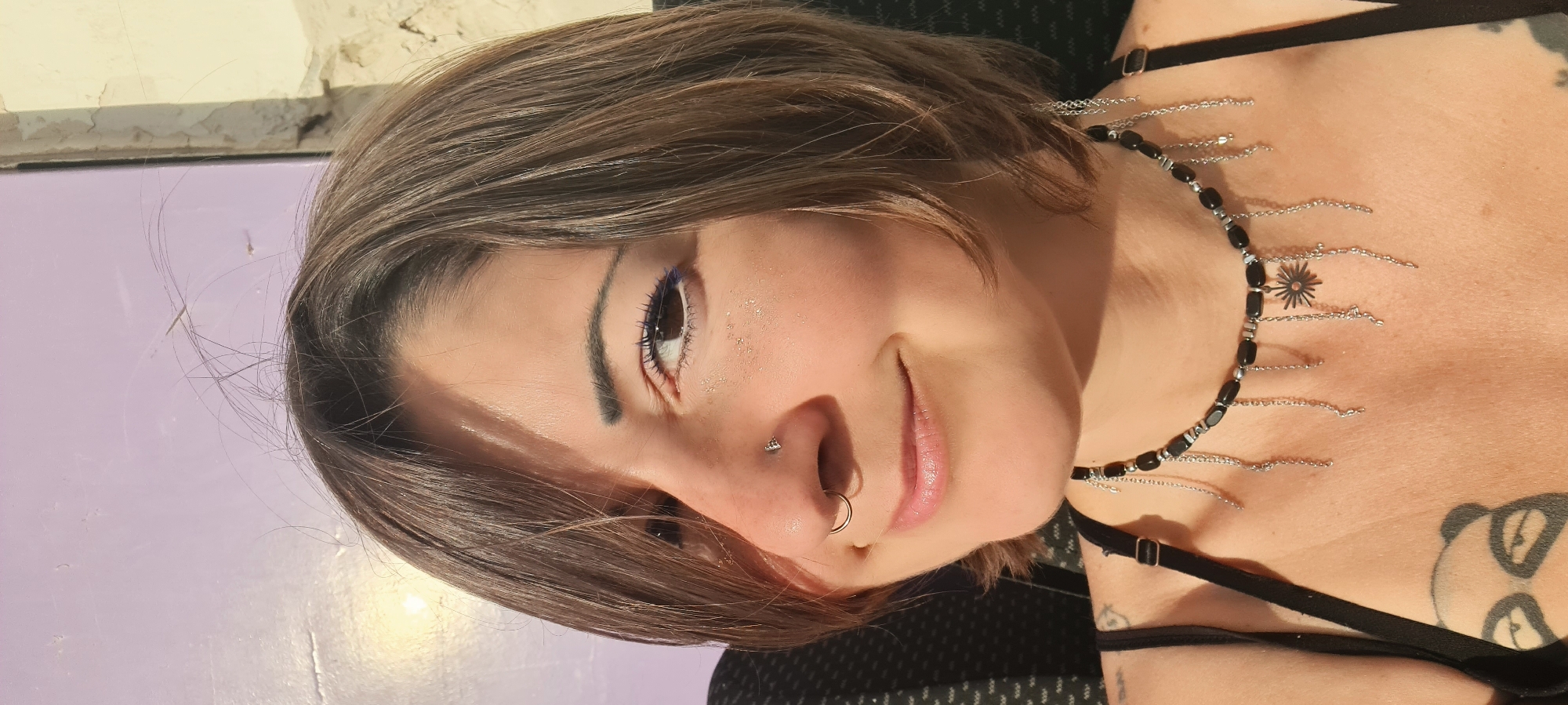 A woman with short brown hair smiles at the camera. She has a nose ring and a stud in her nostril. Blue eyeliner accentuates her eyes, with glittery sparkles beneath. She wears a black beaded necklace with silver chains and a sunburst charm. A black bra strap is visible. She has a panda bear tattoo on her chest. The background features a light purple surface and a textured wall.