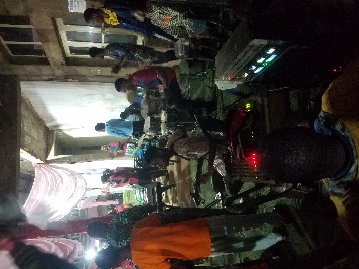 The image depicts an indoor or semi-enclosed space within a city of Unknown, Unknown, serving as a venue for a musical event. The environment features unfinished concrete walls and exposed ceiling elements. Large drapes of light pink and white fabric are suspended along the left side and in the background, suggesting temporary decoration. A multi-paned window is visible on the right wall. Approximately 15-20 individuals are present, predominantly young adult males. In the immediate foreground, an individual with short dark hair, wearing a yellow garment, is seated with their back to the camera, positioned in front of two stacked audio mixing consoles. These consoles display multiple illuminated indicator lights in red, green, and yellow. To the mid-left, a person in an orange t-shirt and light pants stands near a black electronic keyboard on a stand. Behind them, another individual in a green patterned shirt is partially visible. Further back and to the left, a group of people, some wearing red shirts, are gathered. In the central mid-ground, a person wearing a patterned shirt is seated and actively playing an electric guitar. To their right, a drummer in a red and blue striped shirt is seated at a drum kit, engaged in playing. Several individuals are standing to the right, observing the performance; one person in a dark blue patterned shirt is clapping, and another in a yellow jacket is observing. One person is seated to the far right, also observing. The scene is illuminated by artificial light, creating dim overall conditions with focused lighting on the performers and equipment. The arrangement of subjects and objects indicates a live musical performance or rehearsal in a communal setting.
