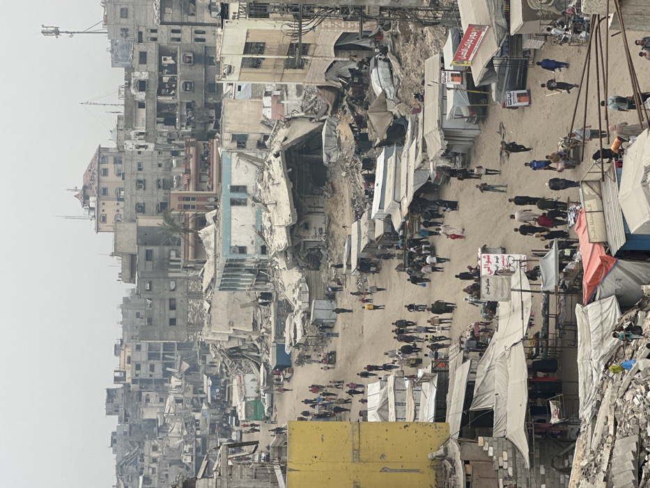 Devastated urban landscape featuring collapsed buildings amidst dense residential structures. A crowded marketplace with makeshift stalls and bustling pedestrian activity fills the central space. Tents and awnings provide shelter, while debris and rubble litter the ground. The scene portrays a sense of resilience and community amid destruction.