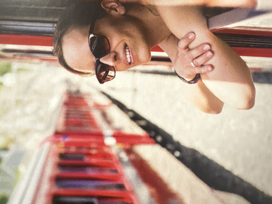 A woman with sunglasses smiles, seemingly upside down, possibly hanging over the edge of a tall structure. Below her, a red-colored structure resembling a staircase or railway extends into the distance with a darker element dividing it. Her skin tone is light. She has a silver ring on one of her fingers.