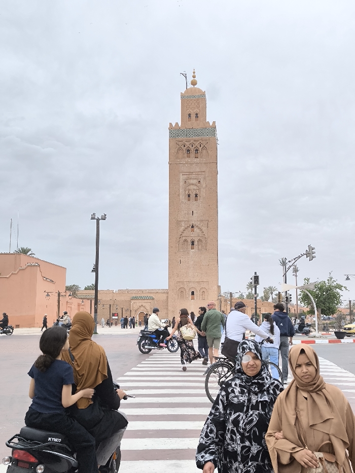 - "The image depicts an active urban street scene in Marrakesh, Morocco, with the prominent Koutoubia Mosque minaret dominating the background under an overcast sky" by FM-jgNAL2, licensed under CC BY 4.0