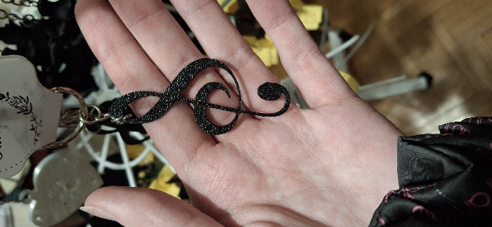 - "A human left hand is positioned palm-up, holding a black, glitter-covered treble clef keychain" by FM-VQdth2, licensed under CC BY 4.0