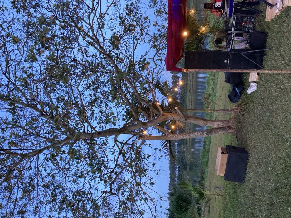 The image depicts an outdoor event setup at dusk in Murera ward, Kenya, beside a body of water. A large deciduous tree, partially bare with some green leaves, stands centrally, illuminated by strings of warm-toned bulb lights wrapped around its trunk and branches. To the right, a red canopy shelters a DJ station, featuring stacked black speakers, a table with electronic equipment including a mixer/controller and a Yamaha keyboard, and additional string lights hanging overhead. One individual, wearing a patterned shirt, is partially visible behind the DJ console, engaged with the equipment. Another person is dimly visible further back near the setup. On the ground to the left, a black speaker or case is topped with a cardboard box. The foreground is covered in green grass. In the midground, beyond the tree and setup, a calm body of water reflects the twilight sky. The far bank is lined with a dense growth of trees or vegetation, extending to the horizon under a clear blue-grey sky.