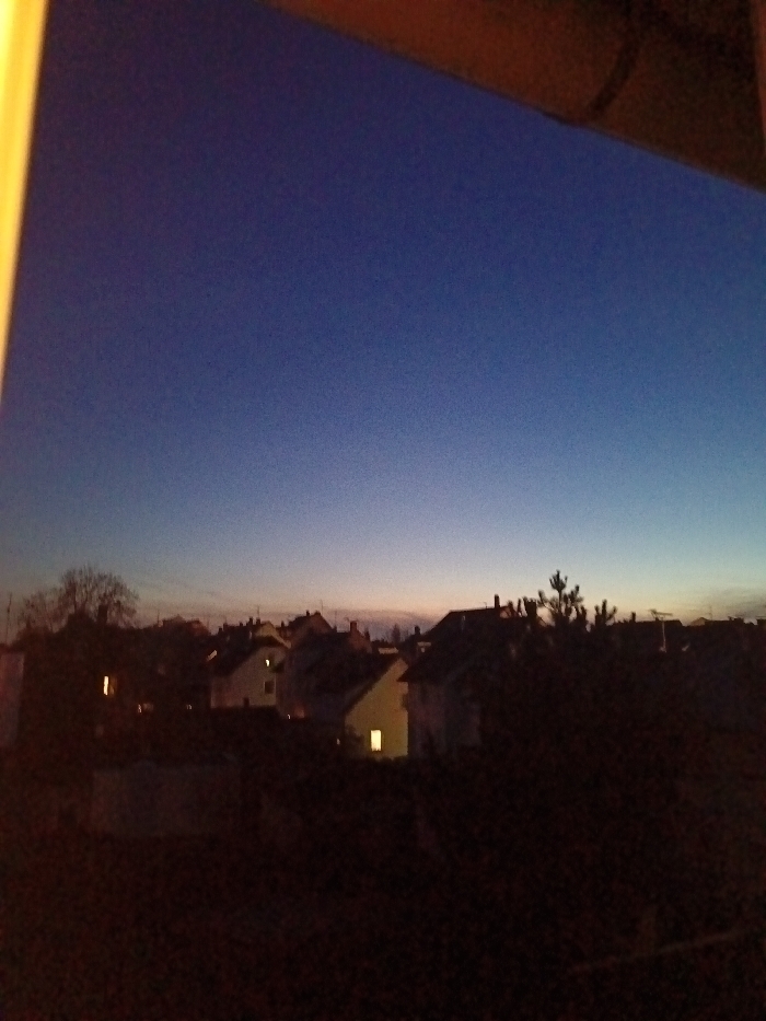 The image depicts an outdoor twilight scene of a residential area in Bischheim, France, viewed from an elevated perspective. The sky dominates the upper two-thirds of the frame, exhibiting a gradient from dark indigo blue at the top to a lighter, paler blue near the horizon, with a subtle hint of orange-pink on the distant horizon line. The lower third of the image is occupied by a dense cluster of detached houses or small residential buildings, mostly silhouetted against the dim light. Several windows within these structures emit warm, yellow artificial light, indicating interior illumination. Bare deciduous trees are visible on the left side, while evergreen trees are present among the houses on the right. No individuals, specific actions, or interactions are discernible. The top and left edges of the frame show dark, out-of-focus elements, likely parts of a window frame or balcony structure.