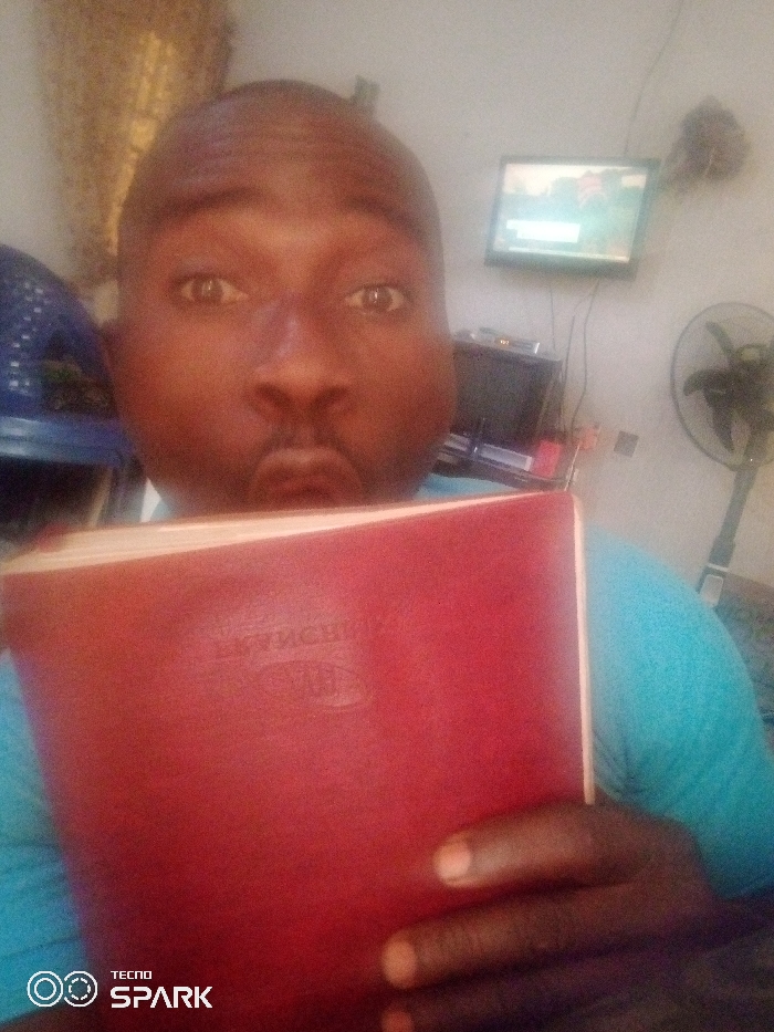 An adult male subject is depicted in a close-up, self-portrait photograph taken indoors in Ajaokuta, Nigeria. The subject has dark skin, a bald head, and a thin mustache. His eyes are wide open, and his lips are pursed. He is wearing a light blue, long-sleeved garment. His right hand is holding a red book with embossed lettering on its cover. The background reveals a light-colored wall. To the subject's left, a portion of a blue plastic chair is visible. To the right, a flat-screen television is mounted on the wall, displaying content that includes text. Below the television, a dark entertainment stand with electronic devices is present. A standing electric fan with white blades is positioned on the floor to the far right. A patterned curtain or fabric is visible in the upper left background. The image displays a "TECNO SPARK" watermark in the lower left corner.