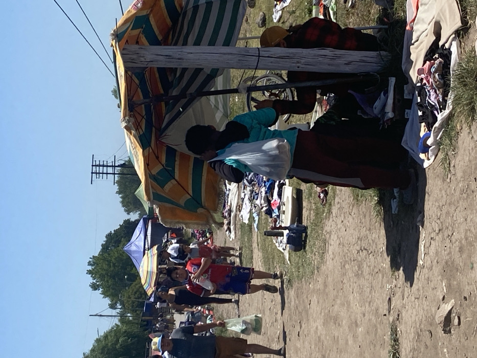 An outdoor market scene shows vendors displaying clothes and wares under striped umbrellas. People walk along a dirt path, carrying shopping bags. One person, wearing a blue shirt and red pants, is seen from the back. Another individual in a red plaid shirt lies near a table. Clothes are spread out on blankets and tables, suggesting a busy day of shopping and commerce. Power lines are visible in the background against a clear blue sky.