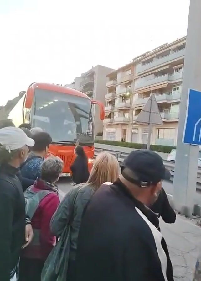 A group of people stand on the side of a road, looking towards a red bus that is stopped in front of them. The bus has its headlights on. Behind the people and the bus are several buildings. A person in a police uniform walks on the other side of the road, while a scooter drives by. The camera moves slightly, showing the people from different angles. A blue and white sign is on a pole next to the people. Some of the people are speaking and pointing.