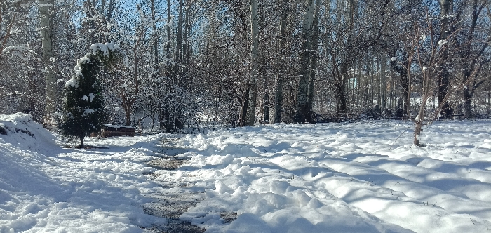 A snowy scene features a tree standing prominently to the left, partially covered with snow. A small bench sits nearby. A path leads into a wooded area with bare trees. The ground is blanketed with snow, with varying depths and drifts, suggesting recent snowfall. The sky is visible through the trees, indicating a sunny winter day. The image captures a quiet, serene winter landscape.