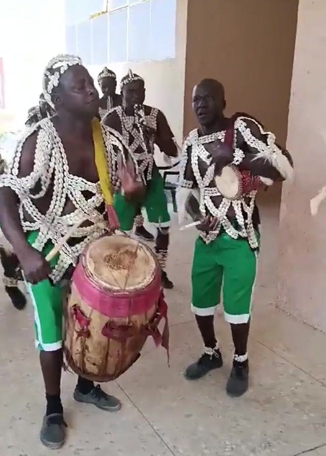 A group of eight men perform in what appears to be a courtyard or covered walkway. Six of the men are dressed in matching outfits consisting of green shorts with white trim, a sleeveless top made of a net-like material adorned with white beads or shells, and similar headwear. Two men play drums; one large and one small. The others may be playing other instruments like flutes. The men are dancing and playing their instruments in unison. A man in graduation garb, a teal gown and mortarboard with a yellow tassel, walks past the performers. The background shows glimpses of the outside with tan or beige buildings.