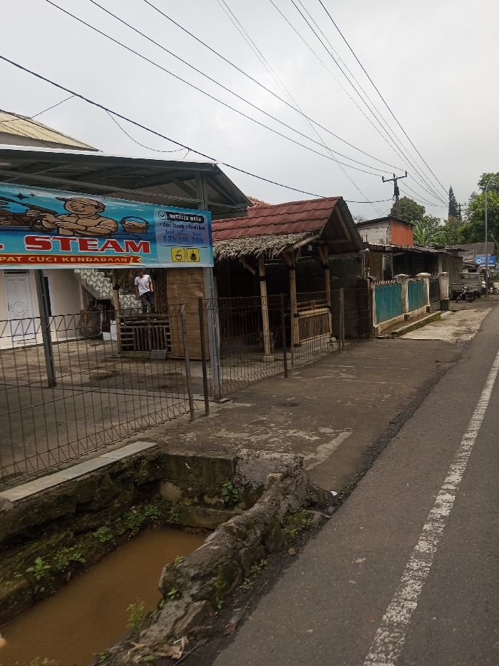A street scene features a car wash with a "Steam" banner and a man standing inside. Adjacent is a bamboo structure with a red-tiled roof. A row of houses lines the street, marked by a blue fence. Power lines stretch across the sky. The road runs along a drainage ditch, partially filled with water. A white line divides the road, indicating traffic lanes.
