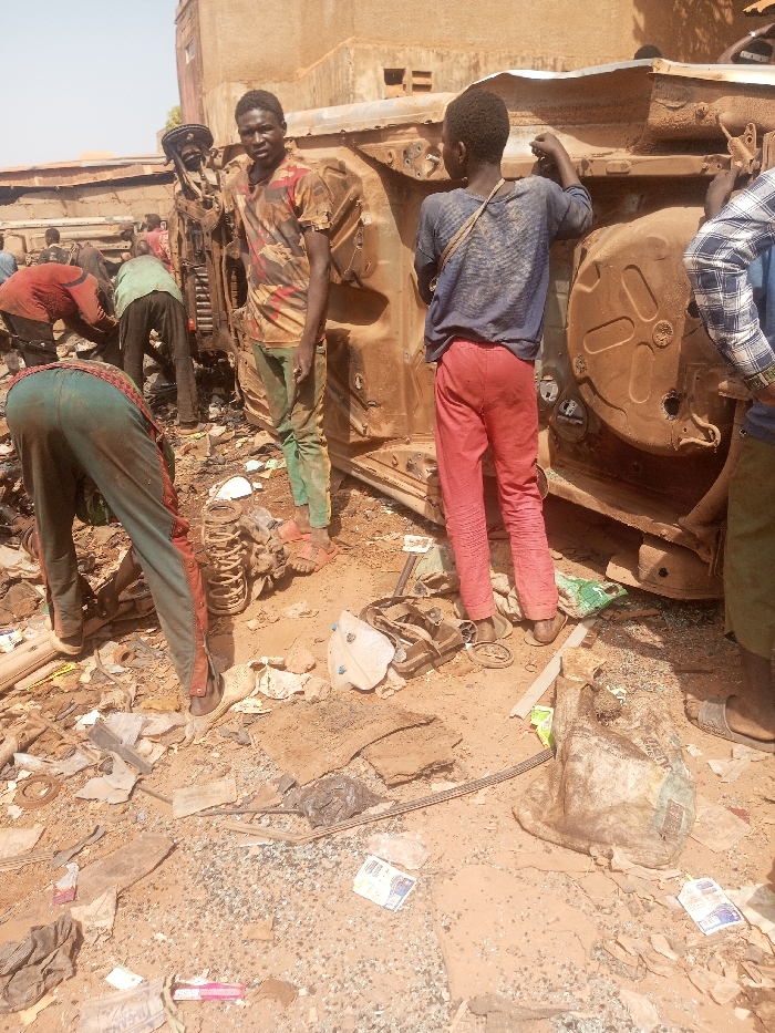 Location: Hayin Banki, Nigeria. The scene depicts an outdoor, dusty, and cluttered environment, likely a salvage or dismantling area, under a clear sky. In the background, a multi-story building constructed of reddish-brown materials is visible. A heavily rusted and structurally compromised metal shell, consistent with a vehicle's undercarriage or chassis, lies on its side, occupying a significant portion of the mid-ground and right side of the image. The metal shows signs of extensive wear and possible heat damage, with multiple circular and irregular openings. Behind this, another similarly damaged vehicle or large metal component is partially visible. Seven individuals are present. One adult male, wearing a multi-colored (camouflage-style) t-shirt and green pants, stands center, looking directly at the camera. To his right, a youth in a dark blue, dirt-stained t-shirt and red pants stands facing away, interacting with the rusted vehicle shell. To the left, an adult in a green top and pants bends forward, examining items on the ground. Behind these individuals, several others are partially visible, similarly engaged with debris and other metal structures. All visible individuals appear to be wearing dirty clothing and sandals or are barefoot. The ground is uneven, consisting of dry earth, small rocks, and scattered debris. Visible objects include several large metal springs (consistent with vehicle suspension components), various pieces of scrap metal (rods, twisted sheets), discarded plastic fragments (including white pieces resembling car trim), numerous pieces of paper litter (some resembling currency notes), and a large, dirty, off-white sack or bag on the right. Individuals are actively engaged in activities consistent with dismantling, sorting, or salvaging materials from the damaged vehicles and surrounding debris.