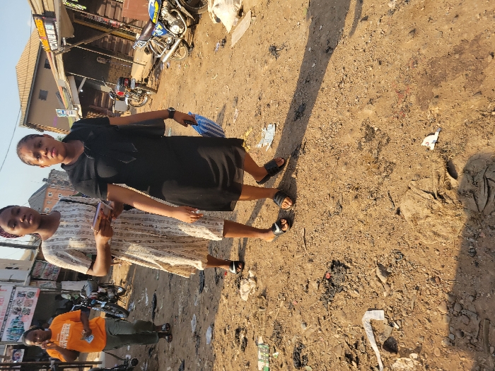 Two women walk on a dusty, litter-strewn ground. One wears a black dress and holds a blue bag. The other wears a tan and white patterned dress and holds a small book. Behind them, a man in an orange shirt stands near a parked motorcycle. Buildings and signs are visible in the background. The scene is illuminated by bright sunlight, casting harsh shadows. The overall impression is one of a bustling, gritty urban environment.