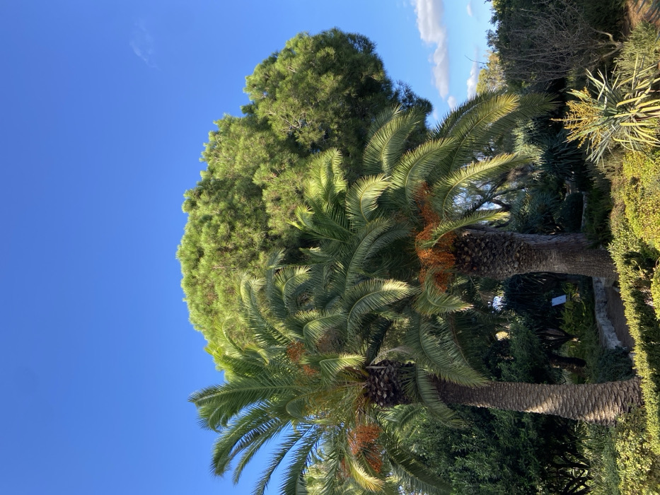 The image displays a botanical garden or park in Unknown, Unknown. Two mature palm trees with fibrous trunks and clusters of orange fruit are centrally positioned in the mid-ground. Behind them, a large, dense, dark green conifer with a rounded crown occupies the upper-middle frame. The foreground contains low, manicured green hedges and various plants, including a spiky, succulent-like plant with a yellow inflorescence stalk on the lower right. A narrow, light-colored path or stone border is visible between the two palm trees, leading into the background which consists of additional green foliage. A small, rectangular blue sign on a pole is partially visible to the left of the right palm tree. The scene is illuminated by bright daylight under a clear blue sky with a few sparse white clouds in the upper right. No people or animals are present.