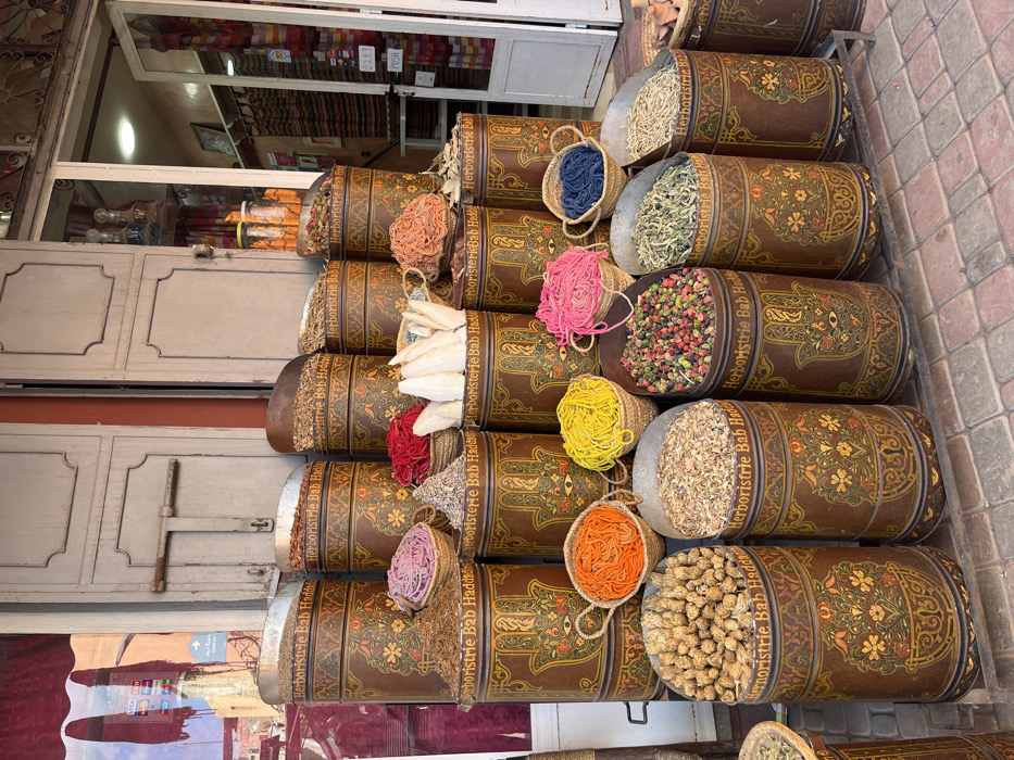 A street-level view depicts the storefront of "Herboristerie Bab Haddad" in the Medina of Marrakesh, Morocco