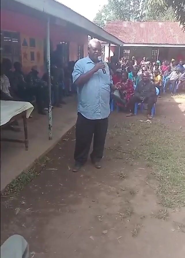 man speaking into a microphone in front of a seated audience in an outdoor setting. The man, who appears to be middle-aged with thinning gray hair, is wearing a light blue short-sleeved shirt and dark pants. He is holding a black hat in his left hand. He is speaking towards the crowd, and his posture suggests he is addressing them formally. The audience is seated on plastic chairs and is composed of men and women of various ages. They are dressed in casual clothing. Behind the audience is a building with a corrugated metal roof. To the left of the speaker, there is a covered porch with people sitting on chairs and benches. There is a table on the porch as well. The ground is dirt and patchy grass. The lighting suggests it is daytime, and the sky is visible through the trees.