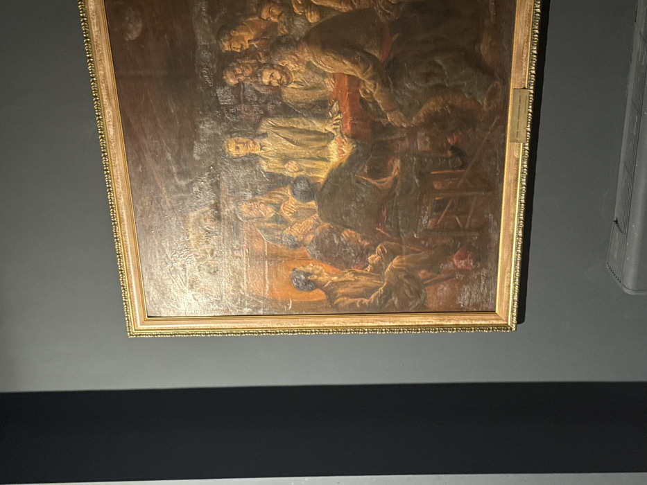 An oil painting titled "In the Secret Revolutionary Committee" by Nikola Kozhuharov is displayed on a dark grey wall within the National Museum of Military History, located at 92 Cherkovna Street, Sofia, Bulgaria