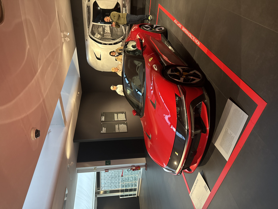 The image captures the interior of the Ferrari Museum in Maranello, Italy