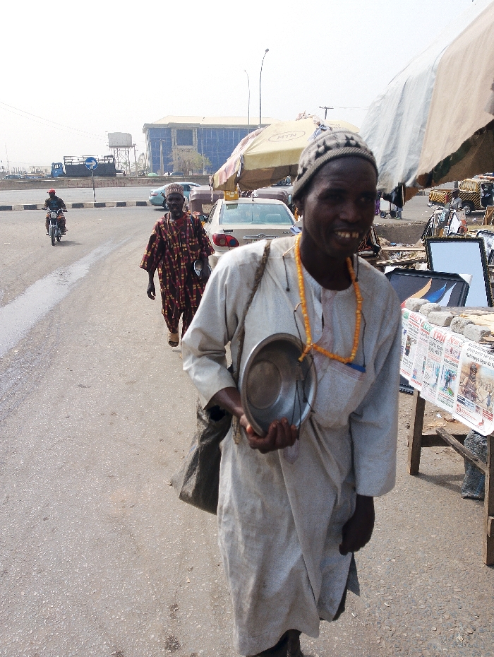 An older man in a light-colored robe and knitted cap walks toward the viewer, holding a metal bowl, possibly begging