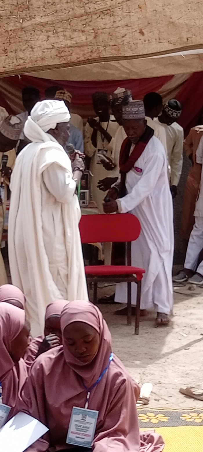 The image depicts an outdoor gathering in Dakata, Nigeria, under a temporary canopy constructed from a patterned light fabric and a red banner