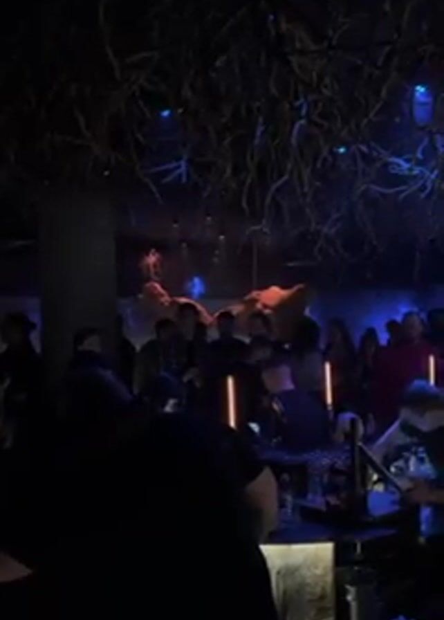 dimly lit indoor scene, seemingly within a crowded club or bar. The lighting is dark with accents of blue and orange, creating a nightlife atmosphere. Overhead, the ceiling is decorated with a sprawling structure resembling branches or roots, adding a distinct decorative element. A bar area is visible in the foreground, with bartenders and patrons interacting around it. The scene is bustling, with people standing in groups, and some are seen moving about. The audio indicates music playing in the background, contributing to the ambiance of a social gathering or party.