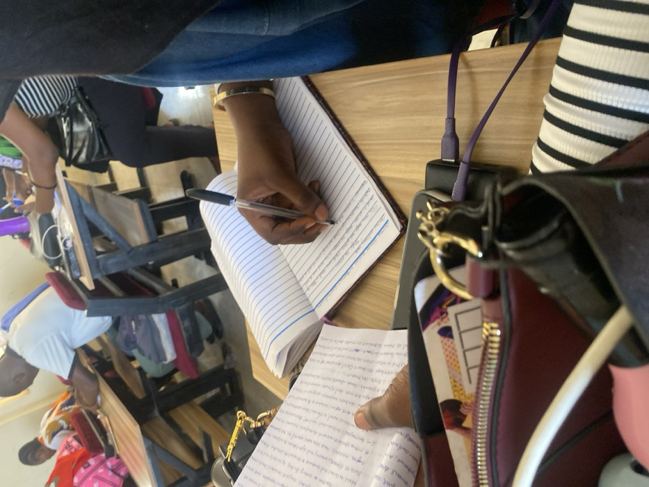The scene depicts an indoor study or classroom environment in Baganakwo, Nigeria. In the immediate foreground, a dark red handbag with gold-colored hardware is visible on a light wooden table surface. Adjacent to the handbag, a black power bank is connected to two purple USB cables, also resting on the table. A hand with light brown skin, possibly belonging to the individual capturing the image, holds a white sheet of paper covered with handwritten text in blue ink. To the right, another right hand with light brown skin, adorned with a gold-colored bangle, holds a clear ballpoint pen and actively writes in a white lined notebook, which is open on the same wooden table. In the background, multiple individuals are seated at light wooden desks with dark frames and red cushioned chairs. One male individual with a bald head, wearing a white short-sleeved shirt and light green trousers, is seen from a rear-angle, occupied at his desk. Another person wearing a black and white striped top is partially visible to the right, and a person with a pink backpack is visible further back. A light-colored wall forms the background.