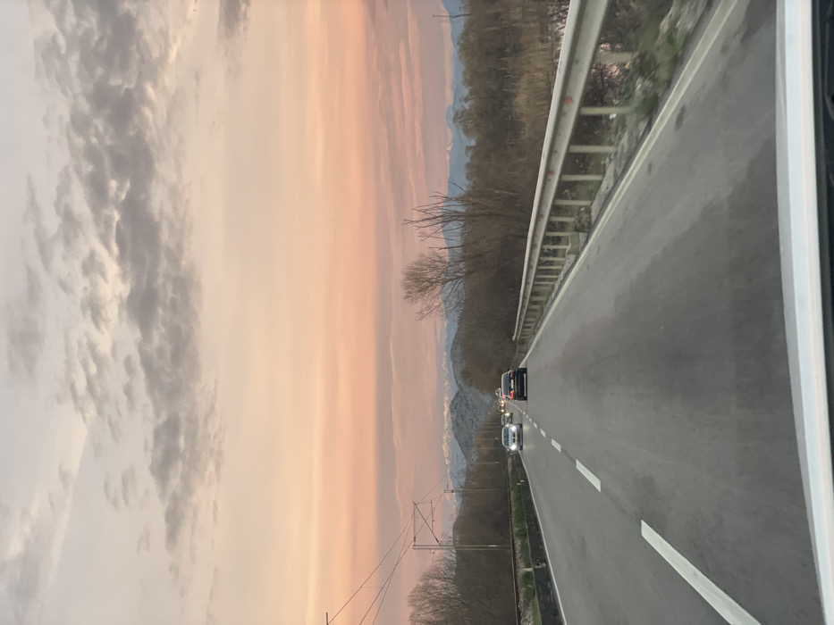 A highway stretches into the distance, bordered by a metal guardrail on one side and trees on the other. Cars drive along the asphalt, illuminated by headlights. A gradient sky blends from gray clouds to orange hues, transitioning into a clear, light-blue expanse. Distant mountains are subtly visible on the horizon, situated beyond the trees lining the roadway. Overhead electrical lines are discernible against the atmospheric backdrop.