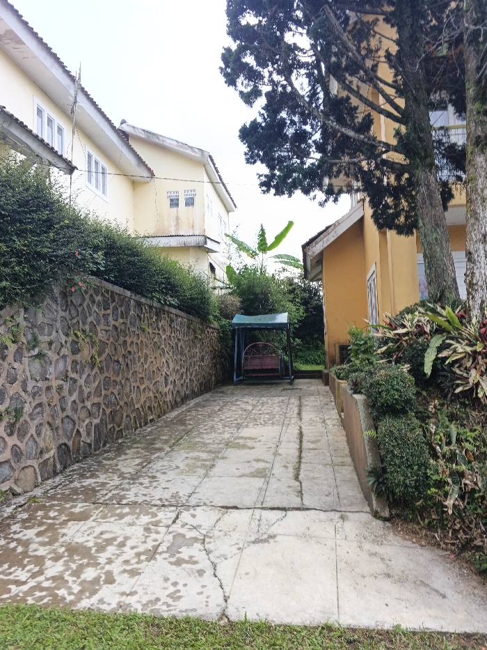 This image presents an outdoor scene in Ream Quarter, Cambodia, depicting a paved pathway bordered by structures and vegetation under an overcast sky. A two-story, cream-yellow building with white-framed windows occupies the left, situated above a textured stone retaining wall densely covered with dark green bushes. The pathway, constructed from square concrete slabs exhibiting cracks and wet patches, extends centrally into the background. To the right, a large tree with dark, needle-like foliage partially obscures a light-orange building. At the end of the visible pathway, a freestanding garden swing is positioned, featuring a dark blue metal frame, a red bench, and a green fabric canopy. The immediate foreground on the left consists of a grassy lawn. No individuals are present.