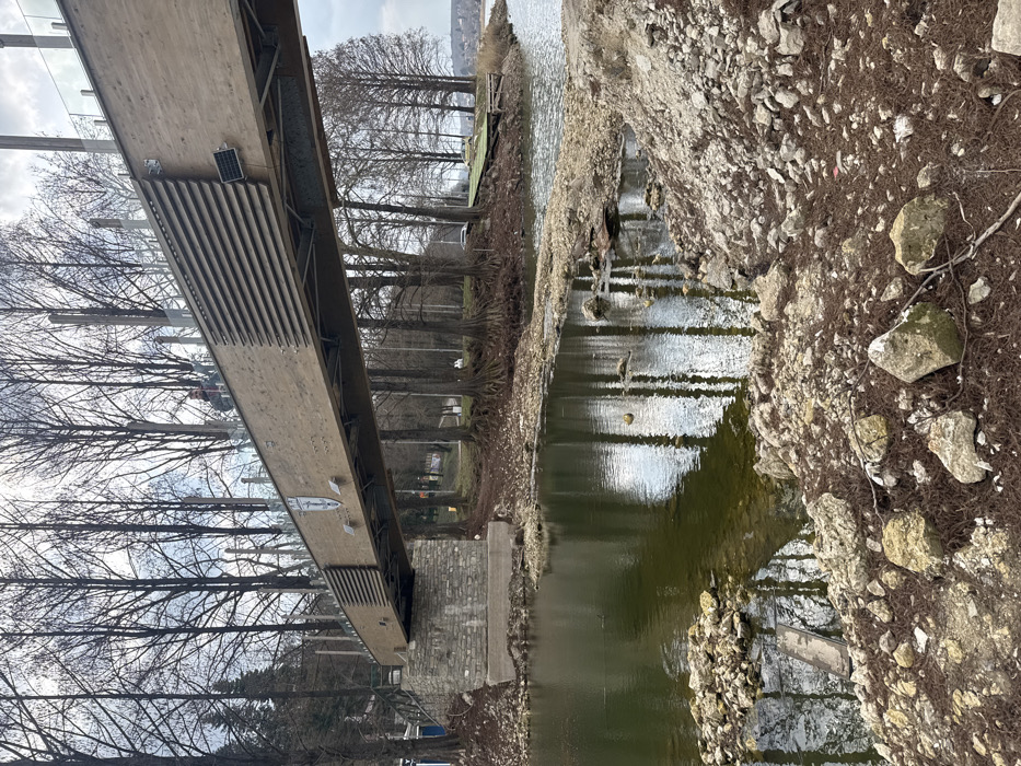 The image displays a modern pedestrian bridge over a body of water within the city of Nikolovo, Bulgaria. The bridge, constructed primarily from light-toned wood planks and beams with a metal substructure, features transparent glass railings along its top edge. Two dark, shield-shaped crests are affixed to the bridge's wooden side. A small black solar panel is mounted on the underside of the bridge structure near its center-right. On the bridge deck, a single person in dark attire stands facing the water on the left side. The bridge's left end is supported by a stone-clad concrete abutment. Below the bridge, the water appears murky green to the left and clearer reflecting the sky to the right, indicating varying depths or water quality. A yellow buoyant object floats in the water directly beneath the bridge, and a partially submerged wooden plank is visible closer to the foreground shore. The water level is notably low, exposing extensive rocky shores composed of light-colored stones and dark, matted organic debris, resembling dried roots or plant matter. Dirt paths are visible along both banks beneath the bridge. The environment is characterized by numerous tall, slender deciduous trees with bare branches, indicative of late winter or early spring. Many of these trees, possibly bald cypress, exhibit prominent, exposed root systems along the water's edge, particularly on the right bank. The sky is overcast with white and grey clouds. In the background, across the water, distant buildings are visible on a rising hillside.