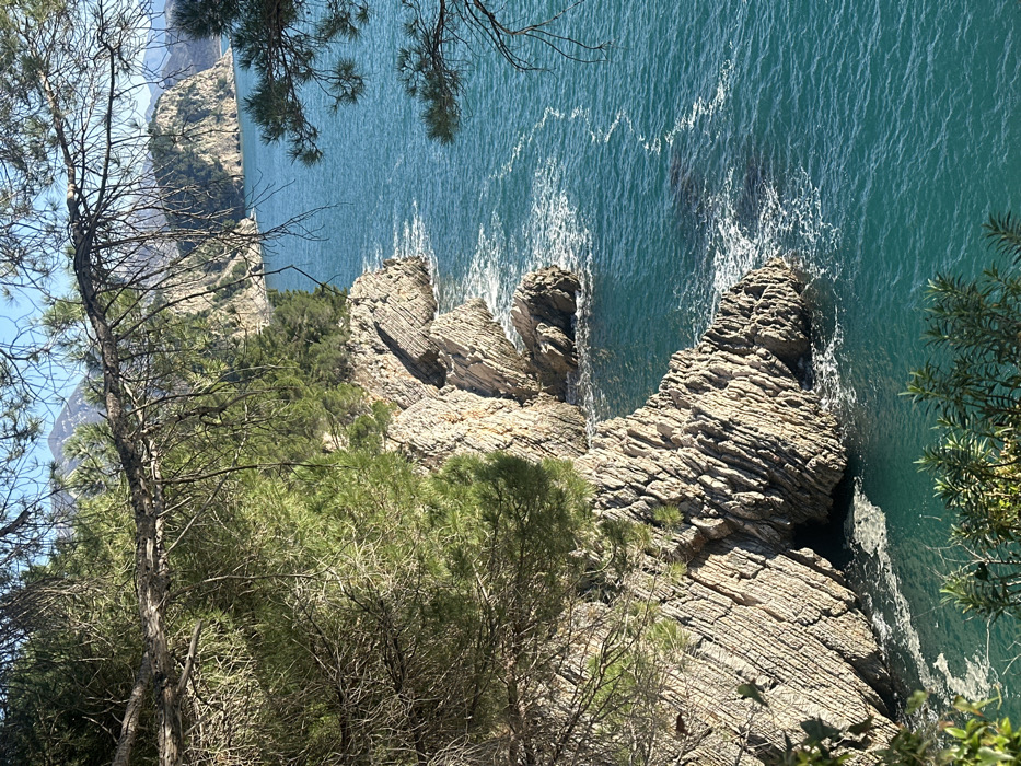 The image displays a rugged coastal scene at Mirište, Montenegro, under clear daylight conditions. The foreground features prominent branches of a coniferous tree, likely pine, with green needles and sparse bare twigs, partially obscuring the view from the top and right. The midground is dominated by steep, layered rock cliffs, characterized by distinct stratification and a light tan-to-gray coloration, descending abruptly into the sea. These cliffs are topped with dense green coniferous vegetation. The water is a vibrant turquoise-blue, exhibiting gentle wave action with white foam visible where it meets the rocky shoreline. In the background, further coastal headlands covered in greenery recede into the distance, with hazy mountain ranges visible beneath a clear sky. No human subjects or man-made structures are present within the frame.