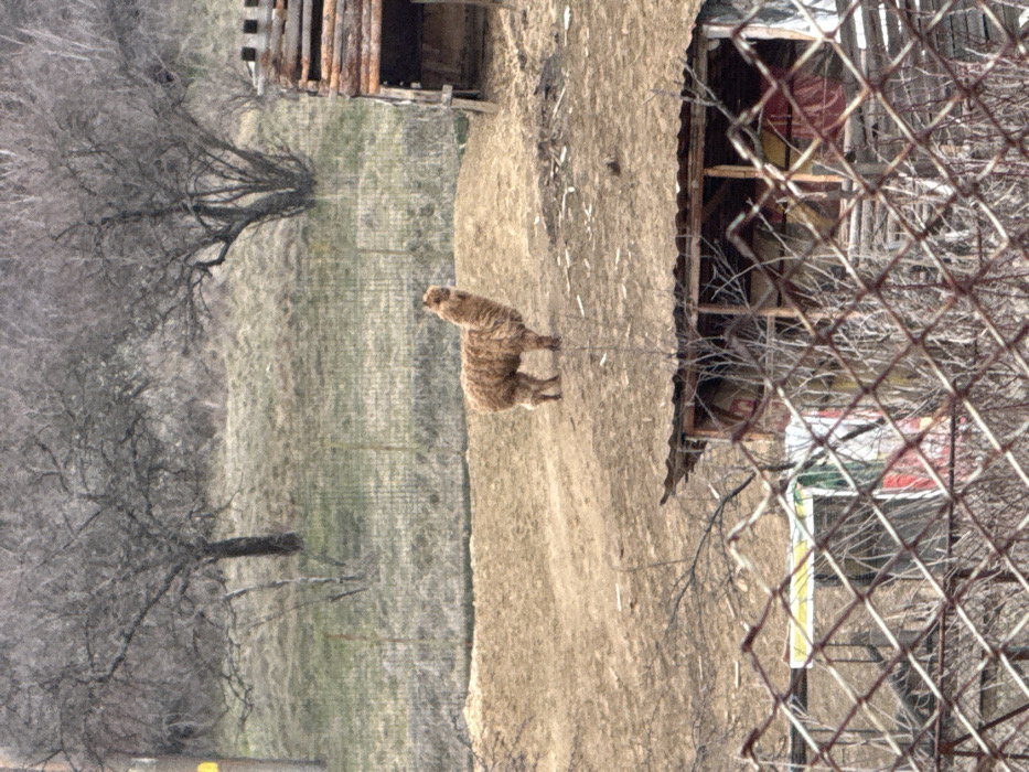 The image captures an outdoor scene in Leskovets, Bulgaria, characterized by a semi-rural or rural environment. In the immediate foreground, a blurred, rusty chain-link fence extends across the bottom, with bare branches and twigs intertwined. Partially visible beneath this fence is the dark, corrugated metal roof of a low-lying structure, which appears to be a shed or storage unit, revealing colorful items or materials inside. Dominating the mid-ground is a single light brown or caramel-colored alpaca, standing on uneven, dry earth. The animal is positioned slightly right of center, facing generally left with its head turned to observe the viewer. Its coat appears thick and shaggy. To the alpaca's right, a rustic wooden shelter, constructed from logs, stands with an open front and a sloping roof. Further back, a wire fence delineates the alpaca's enclosure from a gently sloping hill covered in sparse, dry grass. The background features several bare deciduous trees, indicative of winter or early spring, scattered across the landscape. A yellow vertical utility pole is visible on the far left edge of the background. No people are present in the scene. The lighting is diffuse, suggesting an overcast day.