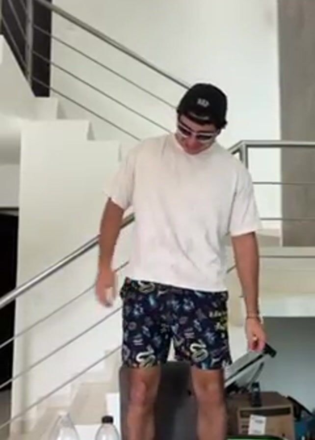 A young man is standing in front of a table in an indoor space. He is wearing a white t-shirt, patterned shorts, a black baseball cap, and sunglasses. He is tapping his thigh rhythmically. Behind him is a modern staircase with metal railings and a white wall. On the table in front of him, there are two water bottles and what appears to be a geometric design. In the background, there is a cardboard box and some exercise equipment. The room is brightly lit.