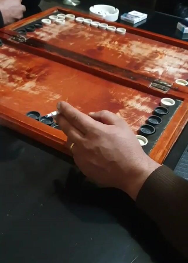 Two people are playing backgammon. One man is holding a cigarette. The backgammon board is open on a black table. There's an ashtray and a pack of cigarettes nearby. The board is wooden and has a reddish-brown finish. The pieces are white and black. One person rolls the dice.