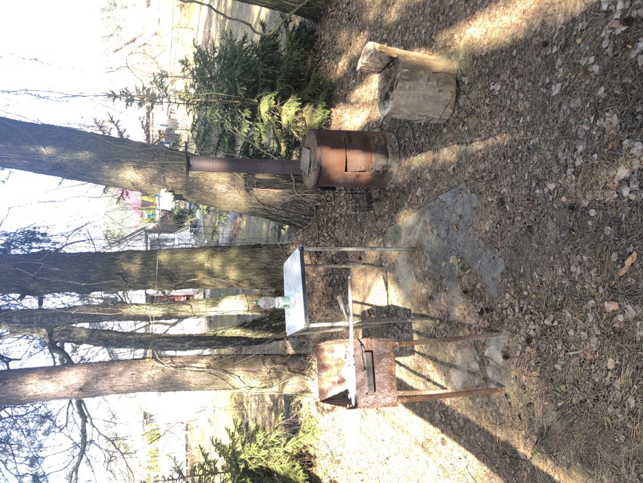 An outdoor scene in Гожскі сельскі Савет, Belarus, depicts a rustic gathering or utility area under bright daylight. The foreground consists of dry, leaf-covered ground with scattered pine needles and a small, irregular concrete slab. From left to right, the primary objects are: 1. A rusty, rectangular metal barbecue grill with four legs, containing white ash and a single metal skewer resting horizontally across its top opening. 2. A small, square table with a metal frame and a light-colored tabletop, positioned directly behind the grill. A clear plastic bottle, possibly containing water or a light-colored liquid, stands on the tabletop. 3. A rusty, barrel-shaped metal stove, featuring a vertical chimney pipe extending upwards from its top. A horizontal access door or opening is visible on its side. 4. A natural wooden log stump, positioned to the right of the stove, serving as a seat. The scene is surrounded by several tall, mature trees with bare branches, some showing vines growing on their trunks, casting long shadows across the ground from left to right. Smaller evergreen conifer trees are visible on the left and right sides of the image. In the background, beyond a visible fence line, parts of white-sided buildings and what appears to be laundry hanging on a clothesline are discernible. No individuals are present in the image, and no active interactions are depicted.