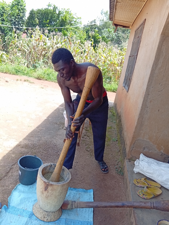 - "A shirtless Black male, wearing dark trousers and black sandals, is actively engaged outdoors, pounding light green granular material within a large, light-colored wooden mortar using a long wooden pestle" by FM-9S6ur1, licensed under CC BY 4.0