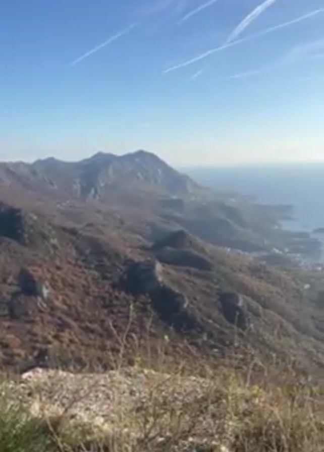 landscape of mountains and a sea coast under a blue sky with airplane contrails. The camera pans from left to right, revealing more of the coastline and the sea, reflecting sunlight on the horizon. The mountains are covered in low-lying vegetation, appearing brown and green in the distance. In the foreground, some dry grass and a few green plants are visible at the edge of what appears to be a high viewpoint. A city is seen along the coast, nestled between the mountains and the sea.