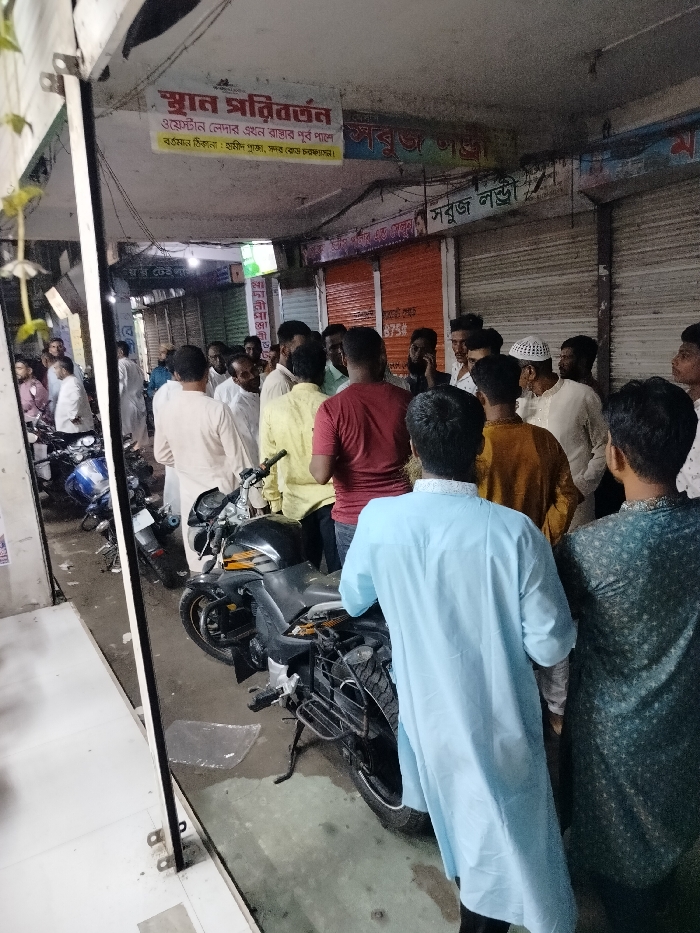 The scene is a street in Charfasson Sadar, Bangladesh. The street is lined with shops and stalls. A group of men, approximately 20 in number, are gathered on the street. Many of them are wearing traditional South Asian clothing. Two motorcycles are parked in the center of the street. One is black and the other is blue. The shops have metal rolling doors and an awning with a sign that reads "Shoe Protection". The awning has writing in Bengali that translates to "Keep shoes and garbage outside". The street is paved with concrete and there is a small puddle on the ground.