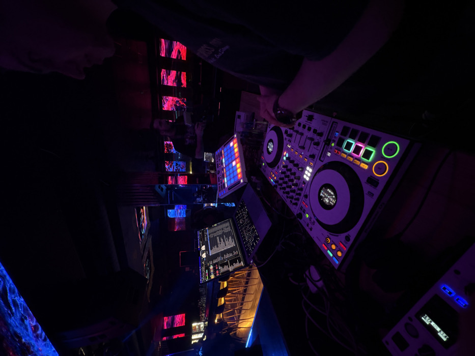 The image presents an interior view of an unidentified nightclub or bar located in Sliven, Bulgaria. The scene is dimly lit, dominated by artificial, colored illumination from LED and neon sources. In the foreground, a white DJ controller is positioned centrally, featuring two large circular jog wheels with internal displays, a mixer section, and numerous illuminated buttons in purple, orange, green, pink, and blue. To the left of the controller, a silver laptop rests on a stand, its screen displaying music production software. Adjacent to the laptop, a sampler or drum machine with a grid of square, multicolored illuminated buttons (blue, red, yellow, green) is visible. A clear glass containing liquid is placed on the surface near the equipment. In the bottom-left corner, a smaller white electronic device shows a digital display reading "120.00 bpm" and "120.00 hz." Various black cables connect the equipment. On the far right, the partial profile of an individual, likely a DJ, is visible from the chest up, wearing a dark short-sleeved shirt. Their right arm and hand rest near the DJ controller. A watch is worn on their left wrist. In the mid-ground, slightly left of center, a second individual stands behind the DJ setup, wearing a dark shirt and holding a dark object. The background features a long bar counter with several golden-hued stools on the far left, illuminated by warm yellow light. The walls behind the bar display multiple rectangular light panels with abstract, wavy patterns in shades of red and pink. The ceiling is dark, with reflective elements illuminated by blue and purple lighting. A vertical, ribbed metallic pillar stands in the mid-background.