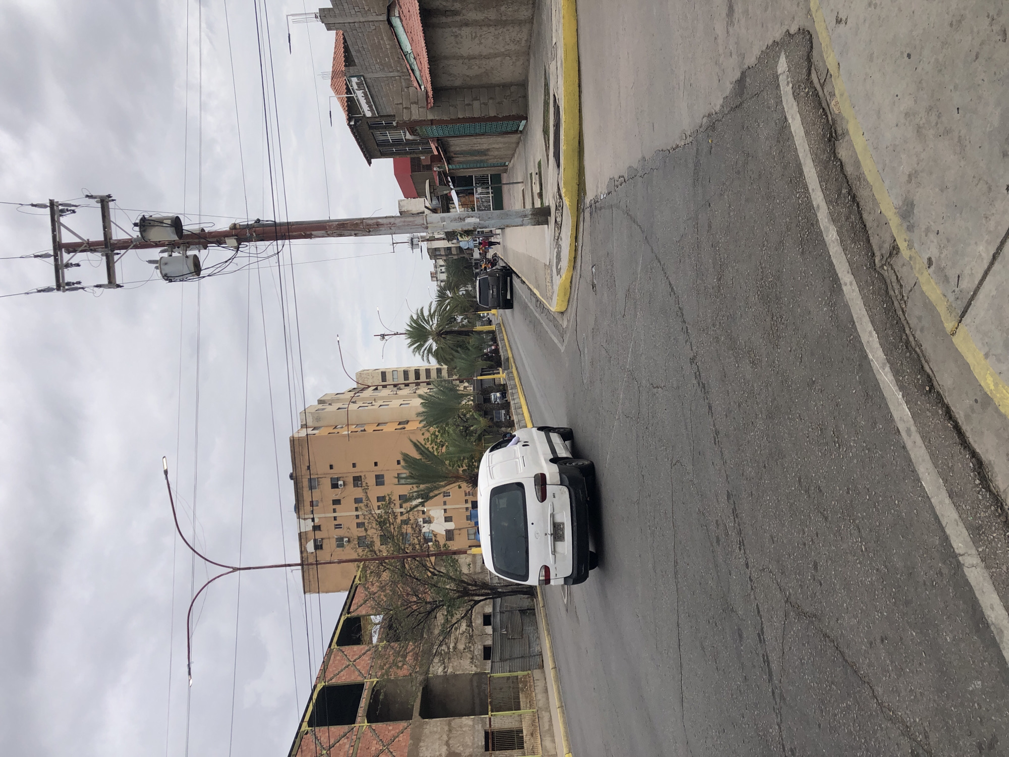 street scene in Juan Griego, Venezuela. A white van is traveling on the street, with a partly-constructed building on one side and a taller apartment building in the background. A utility pole with transformers and several wires stands along the sidewalk. The sky is overcast. The road surface is cracked asphalt with a white lane marker dividing lanes. The sidewalk is concrete and has a yellow curb.