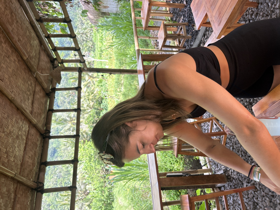 A young adult female, with long brown hair and sunglasses resting on her head, is depicted in an open-air, elevated structure in Sangkan Gunung, Indonesia. She is wearing a black spaghetti-strap top and black ribbed shorts. Her left wrist bears a multi-colored wristband. The woman is leaning forward over a light brown wooden table, with her right arm extended towards a light green or white rectangular bottle. The structure features a woven bamboo roof and bamboo railings, with a dark gravel floor. Beyond the structure, lush green tropical vegetation, including extensive rice paddies and numerous palm trees, extends into the background. Several additional light brown wooden tables and stools are visible within the structure, and a small thatched-roof hut is present in the distant background on the right.