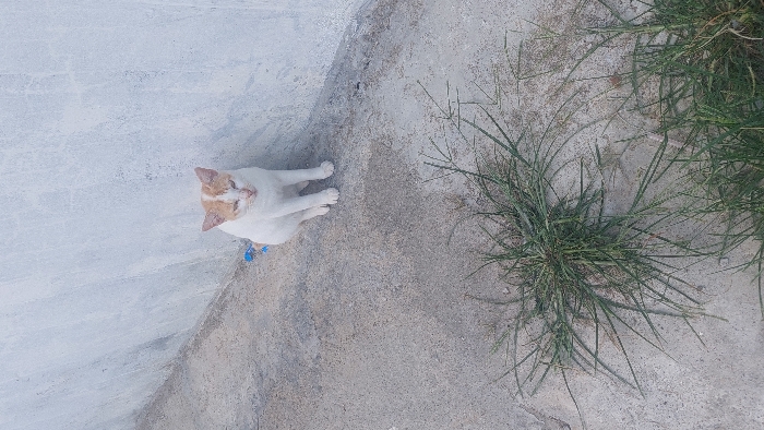 - "A white and orange tabby cat is observed sitting on a light grey concrete surface in the city of Unknown, Unknown" by FM-s5bAy2, licensed under CC BY 4.0