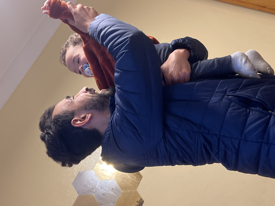 A man with dark hair and a beard lies on his back, wearing a navy blue puffer jacket. He's holding a young child above him, who is wearing an orange shirt, dark pants, and gray socks. The child has a pacifier in their mouth. The background features a tan wall and a geometric tile pattern. The scene captures a tender, playful moment between father and child.