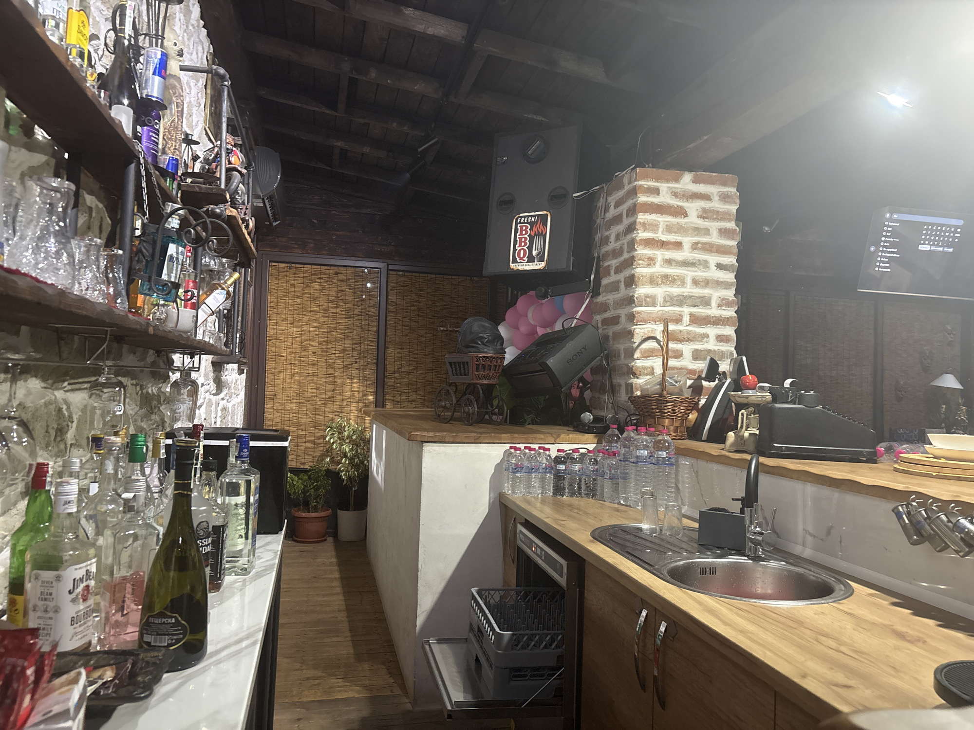 interior of what appears to be a bar or kitchen area, possibly located in Krumovgrad, Bulgaria, judging by Cyrillic text on some of the bottles. There is no indication of people in the frame. The scene features a counter with a sink and faucet. Various bottles of alcohol, including Jim Beam Bourbon and a bottle with Cyrillic labeling "ПЕЩЕРСКА" are placed on a shelf. Some glassware is visible behind the bottles. A dishwasher is partially open beneath the counter. To the right of the sink is a stack of disposable water bottles. A brick column stands next to a stereo speaker and a projector on the back countertop. A black cash register is also present. A TV is mounted on the back wall. The ceiling has wooden beams. There is a partially visible cart with pink and white balloons in the background. There are also several plants in pots.